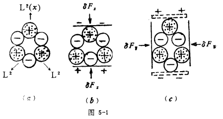 ②當(dāng)不施以壓力時(shí),水晶晶體正、負(fù)電荷中心如圖5-1(a) 分布,設(shè)這時(shí)正、負(fù)電荷中心重合,整個(gè)晶體的總電矩等于零,晶體表面不荷電(不呈壓電性)。