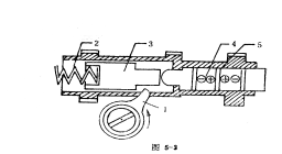 點(diǎn)火器種類(lèi)繁多,現(xiàn)以家用壓電點(diǎn)火器為例說(shuō)明它的結(jié)構(gòu)和工作原理。如圖5-3所示的點(diǎn)火器,可固定在家用灶具上點(diǎn)燃煤氣,轉(zhuǎn)動(dòng)凸輪開(kāi)關(guān)1,利用凸輪凸出部分推動(dòng)沖擊塊3,并壓縮沖擊塊后的彈簧2。當(dāng)凸輪凸出部分脫離沖擊塊后。由于彈簧彈力作用,沖擊塊給陶瓷壓電元件4一個(gè)沖擊力,便在壓電元件兩端產(chǎn)生高壓,并從中間電極5輸出高壓,產(chǎn)生電火花點(diǎn)燃?xì)怏w。